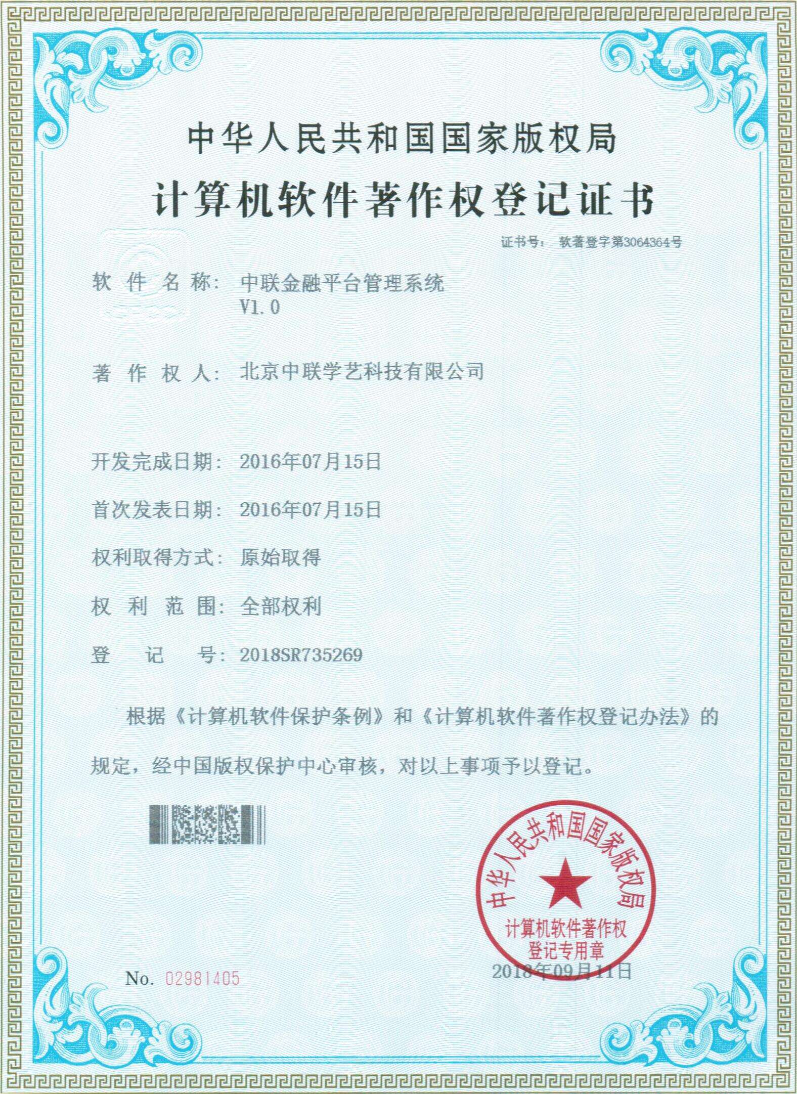 中聯(lián)金融系統(tǒng)軟著權(quán)證書(shū)