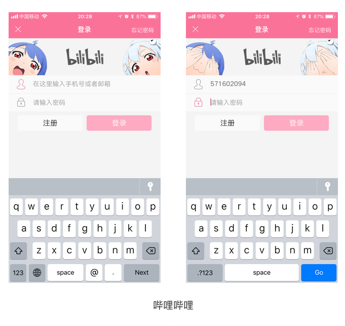 人的肢體語言是很豐富的,而且往往肢體語言比外在的形象更讓人覺得生動(dòng),通用性也更強(qiáng),比如BILIBILI的APP,登錄頁面的UI設(shè)計(jì)就很擬人化,在登錄頁輸入密碼的時(shí)候,頁面上的兩個(gè)小人就會(huì)無助自己的眼睛。